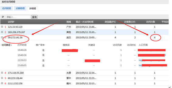 其實(shí)百度統(tǒng)計(jì)關(guān)于IP明細(xì)的信息是很詳細(xì)的(包括訪問(wèn)次數(shù)、搜索詞、關(guān)鍵詞、入口頁(yè)面、訪問(wèn)時(shí)長(zhǎng)等),但是有個(gè)不好的地方,只有實(shí)時(shí)訪問(wèn)的明細(xì),更多長(zhǎng)時(shí)間的數(shù)據(jù)是查詢不到的。所以你還得安裝51la或cnzz。