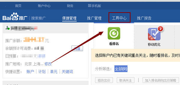 1、打開(kāi)百度推廣帳戶,進(jìn)入搜索推廣界面,在頂部點(diǎn)擊“工具中心”選項(xiàng)卡。