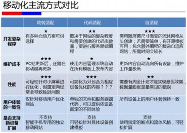 百度官方發(fā)布了PC站點移動化主流方式,今天就接著把這3個方法的具體怎么實施也摘抄過來,希望對大家有用。 我們先來看看幾個方式的對比: 跳轉(zhuǎn)適配 1、百度siteapp。這顯然是標準……